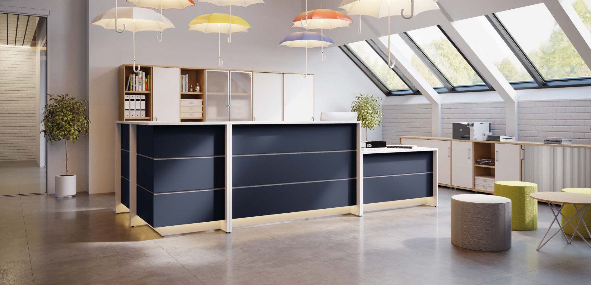 Moduły LN-14 oraz LN-15 są o długości 2 metrów. Posiadają część wysoką z wbudowaną nadstawką oraz cześć niską – idealną do obsługi Klienta. Po dodaniu nóg T-3 popierających blat lub boków LN-10/11 – lada może być samodzielnym meblem. Może też wkomponować się w zestaw, który utworzy dowolnie długą i zakręconą ladę do recepcji.