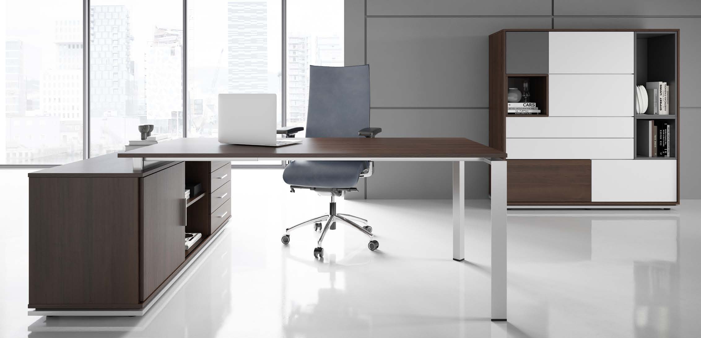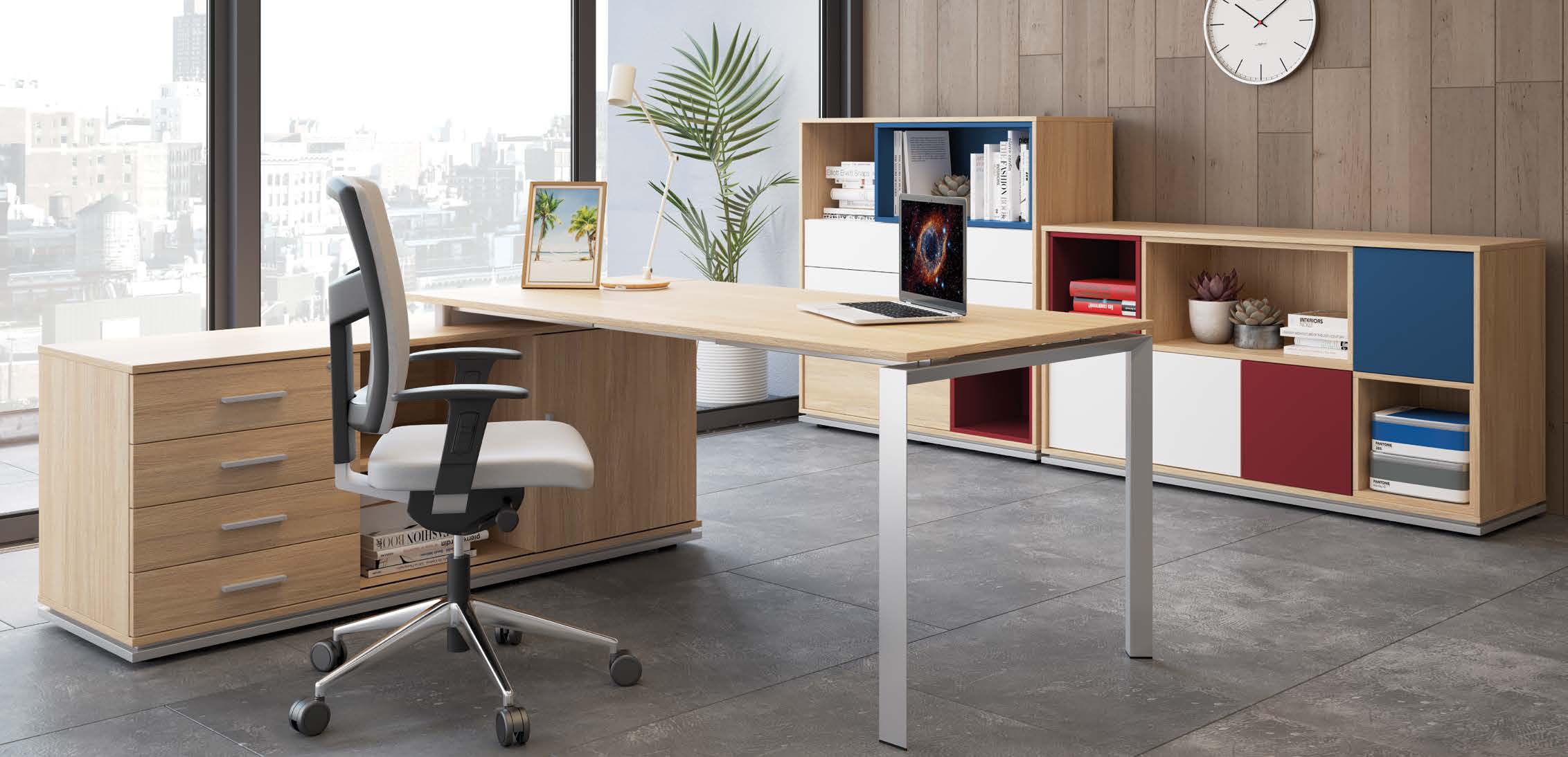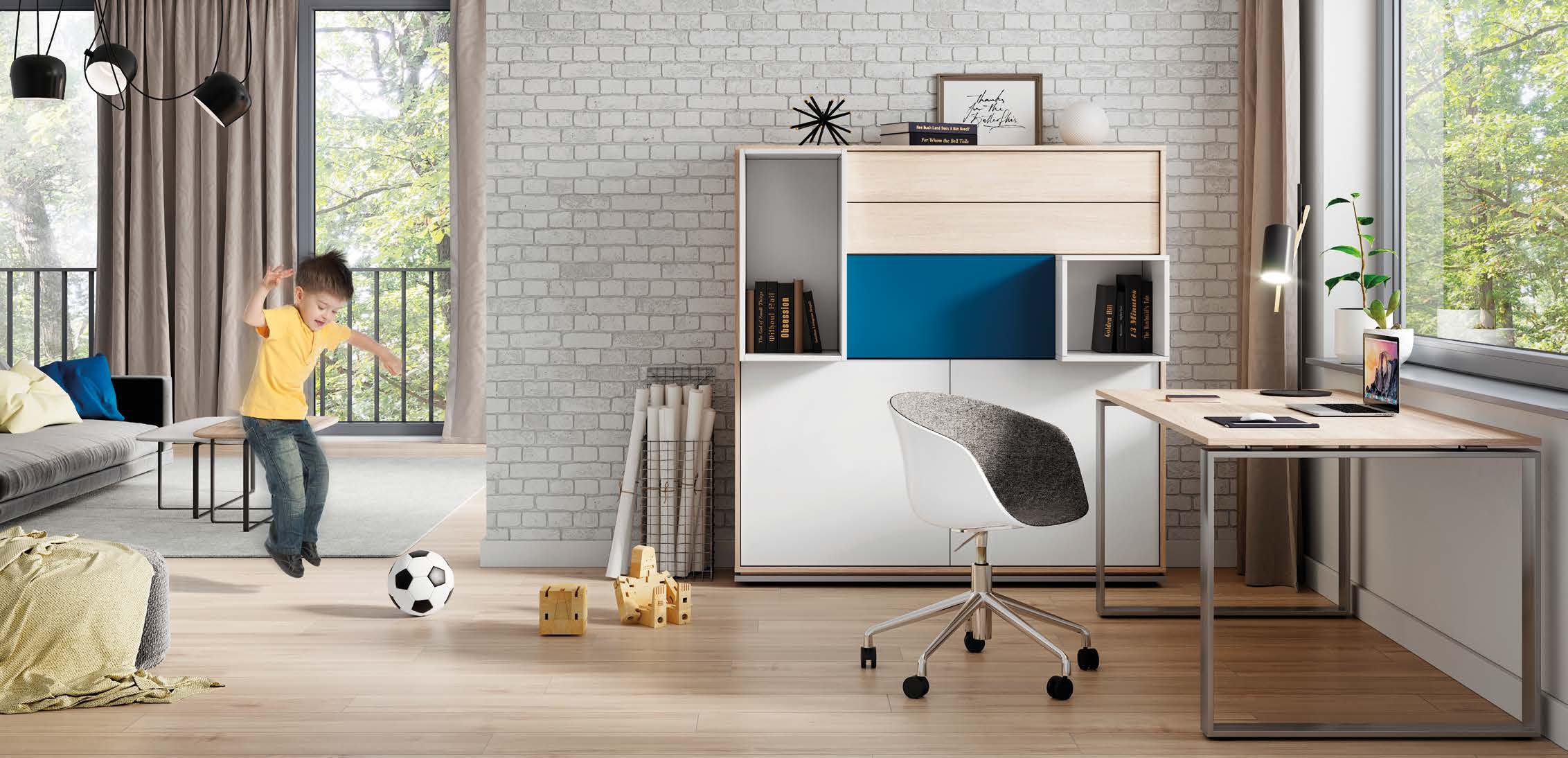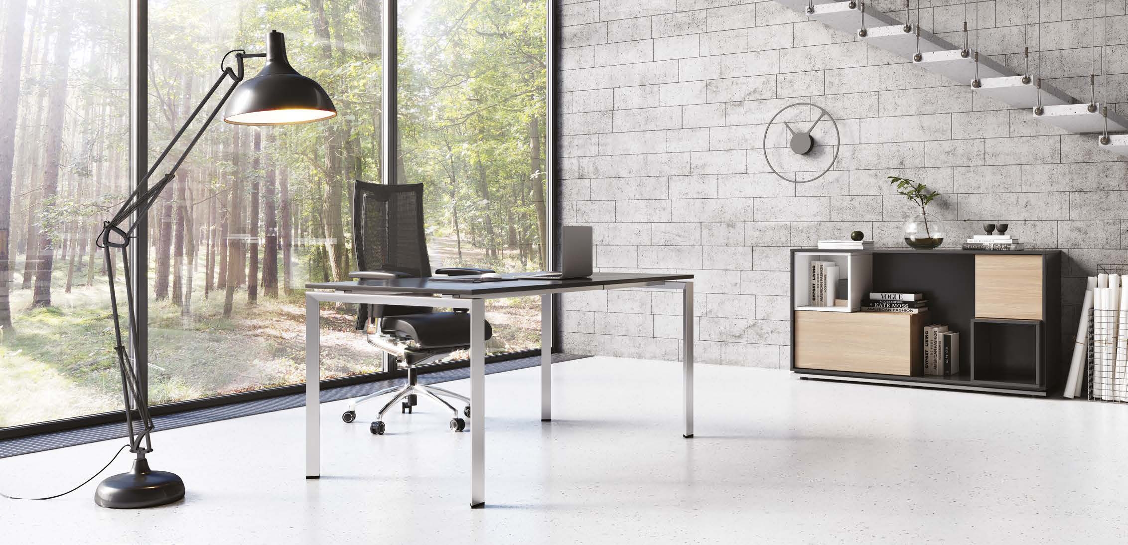 BLOG & TRIO stanowią dwie, nieco odmienne realizacje jednej idei, którą było stworzenie systemu mebli doskonale sprawdzających się zarówno w biurach, jak też w domowych pracowniach. BLOG & TRIO różnią się w aspekcie estetycznym – BLOG, ze względu na zastosowanie kwadratowych stelaży biurka i stołów, odznacza się silniej zdefiniowanym charakterem. TRIO stanowi propozycję bardziej neutralną i odrobinę lżejszą w wyrazie. Oba systemy wykonane są z takich samych materiałów. Cienkie blaty z płyty melaminowanej posadowione są na mocnych, metalowych stelażach malowanych proszkowo na kolor srebrny, a następnie lakierowanych. W biurkach istnieje możliwość zastosowania ozdobnej, szklanej blendy. Biurka oraz stoły występują w wersji samodzielnej lub zmontowanej z komodą. Regały modułowe pozwalają na daleko idącą indywidualizację przestrzeni. Stworzenie mebla według własnego pomysłu nie nastręcza żadnych trudności – elementy wkłada się do środka, nie trzeba tu niczego przykręcać ani mocować.