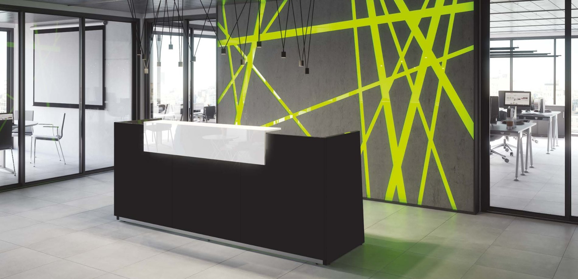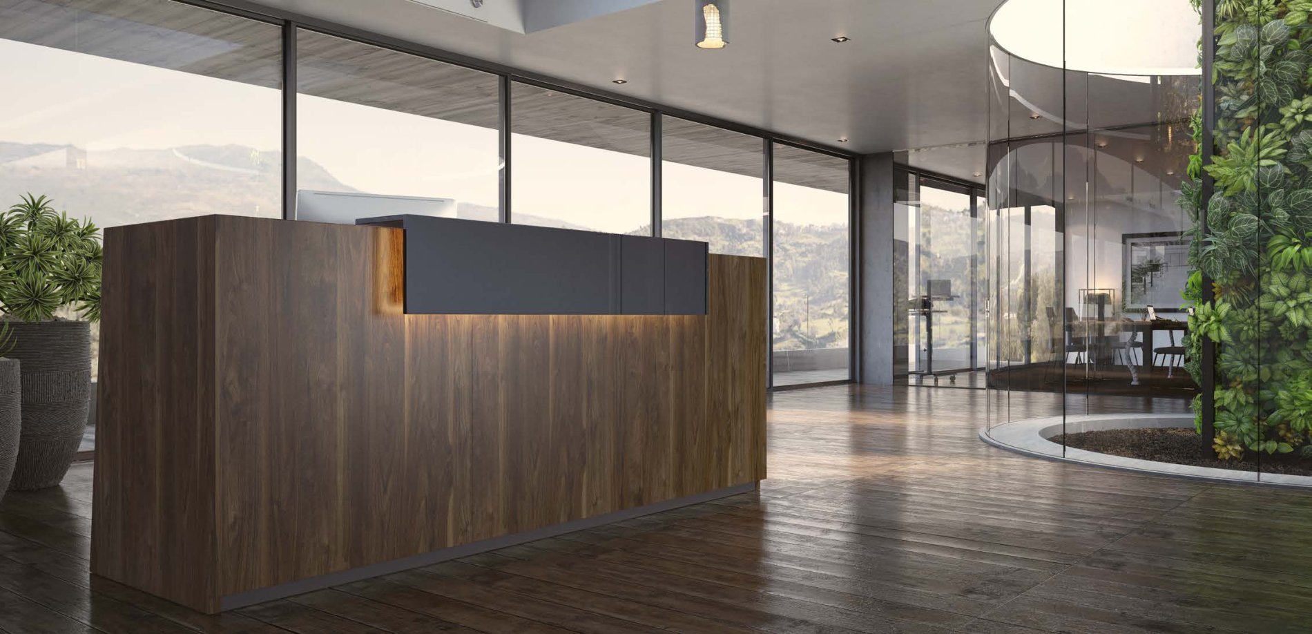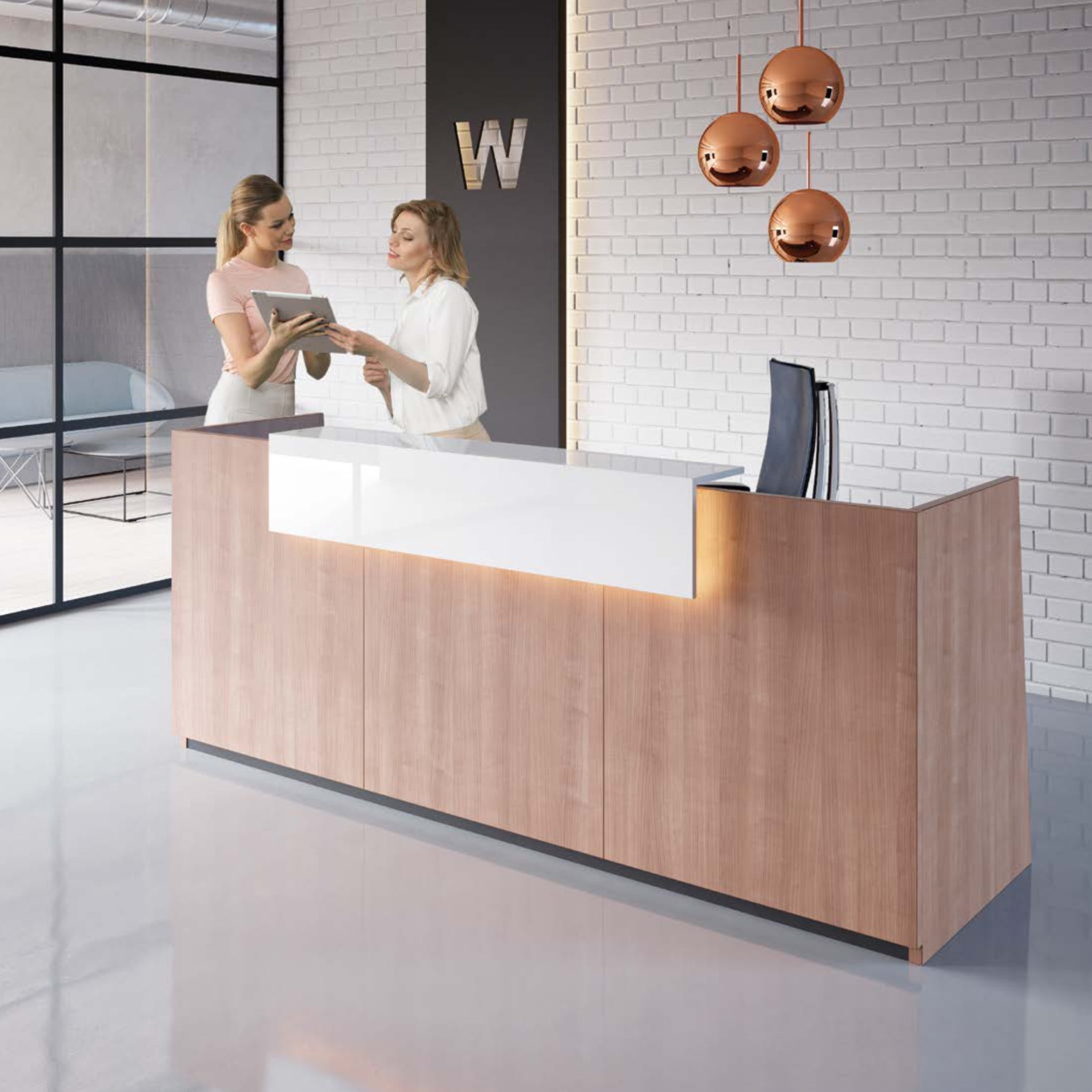 Jednorodny front z wciętym cokołem wyposażono w nadstawkę, która poza kwestiami praktycznymi, posiada niewątpliwy walor estetyczny – przełamuje zwartą bryłę i różnicuje płaszczyzny. Boki lady są ścięte lekko pod kątem.