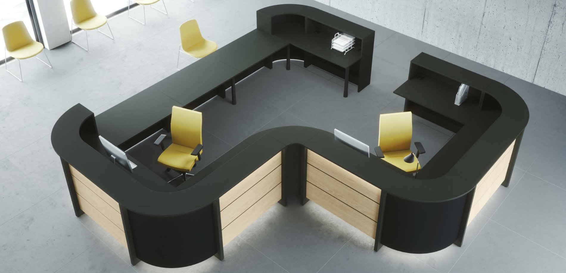 Moduły LN-14 oraz LN-15 są o długości 2 metrów. Posiadają część wysoką z wbudowaną nadstawką oraz cześć niską – idealną do obsługi Klienta. Po dodaniu nóg T-3 popierających blat lub boków LN-10/11 – lada może być samodzielnym meblem. Może też wkomponować się w zestaw, który utworzy dowolnie długą i zakręconą ladę do recepcji.