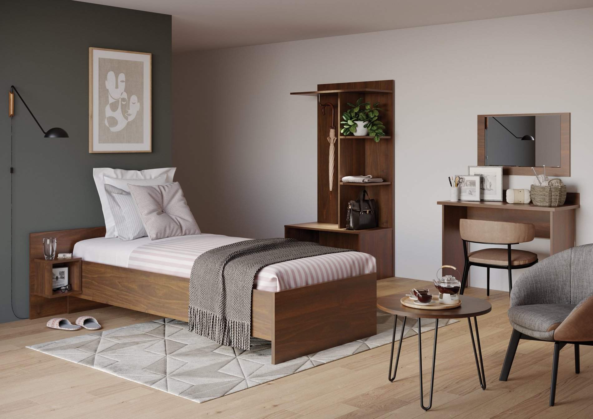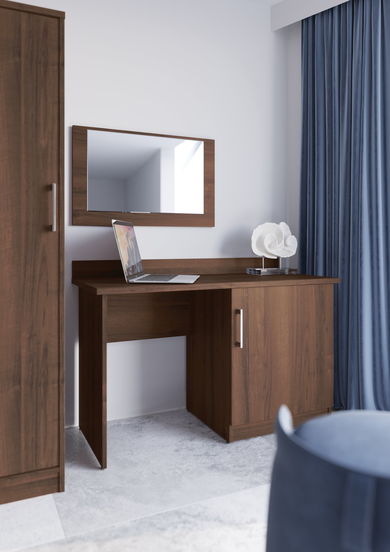 Meble hotelowe Luna to oferta skierowana do obiektów hotelowych, pensjonatów, akademików i apartamentów. Luna to modułowy system mebli hotelowych idealnie prezentujący się w zestawieniu jednokolorowym. Luna to trwałe i funkcjonalne meble w przystępnej cenie. Szeroka gama stylowych biurek, przestronnych szaf, funkcjonalnych wieszaków z lustrem oraz poręcznych szafek nocnych pozwoli na urządzenie praktycznego, sprzyjającego odpoczynkowi wnętrza.