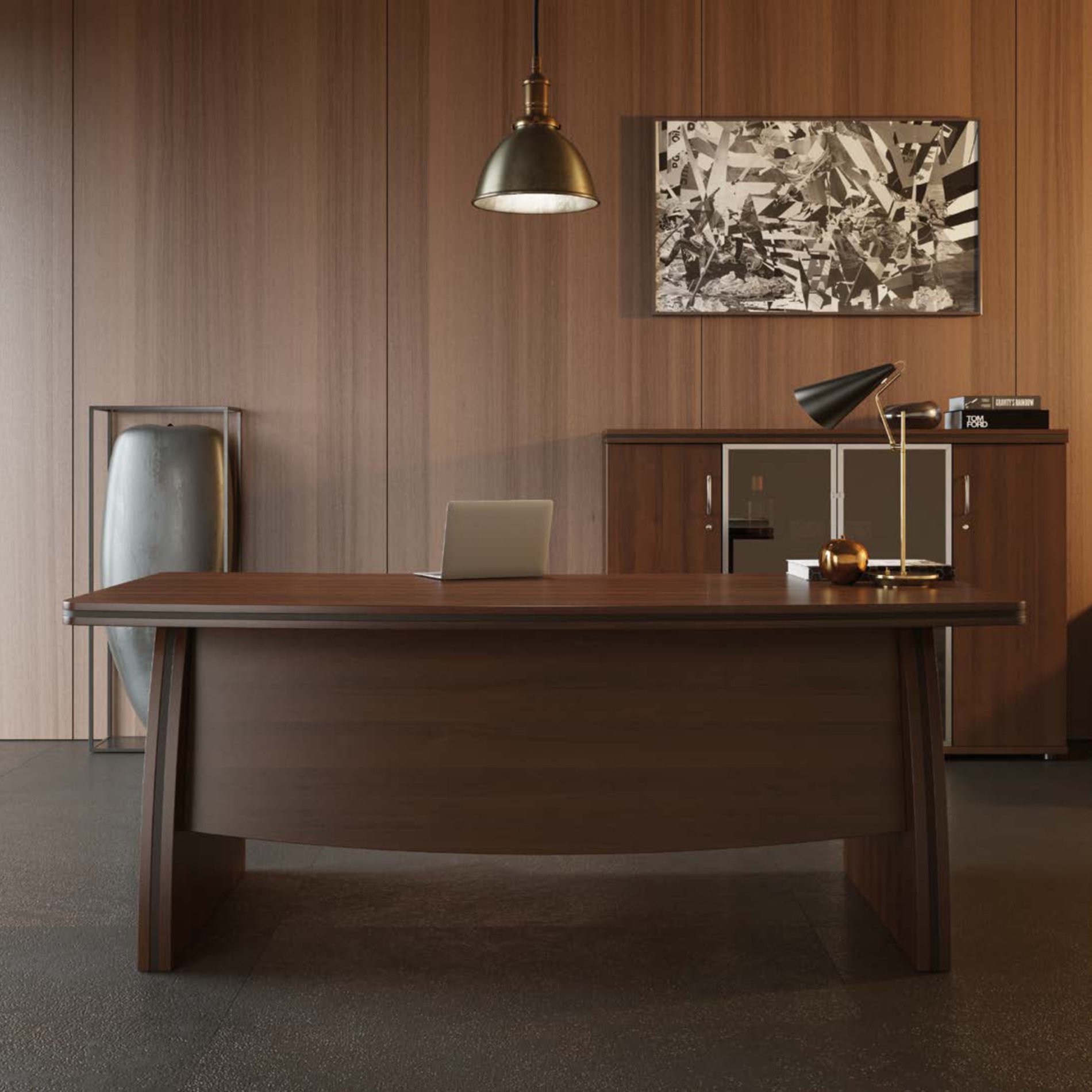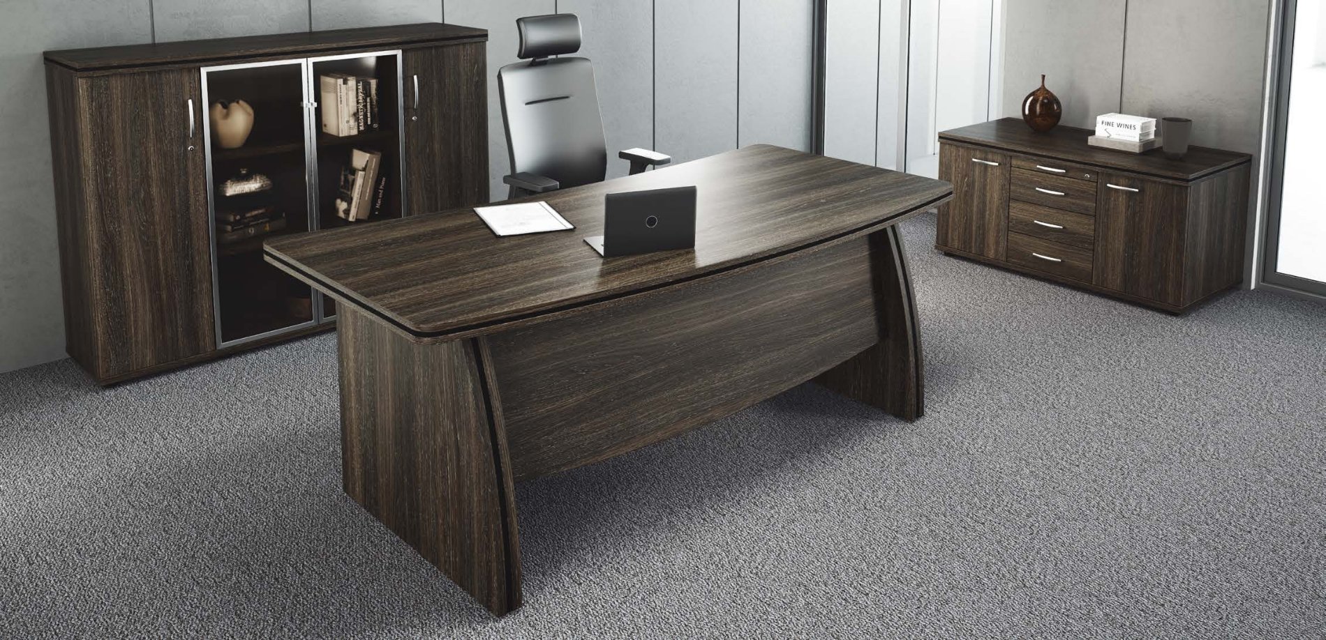 Biurko mocne i masywne. Łagodności formie nadają zaokrąglenia na blacie oraz na podstawach. Intryguje wkomponowana w nie czarna wstawka. Również stół posiada zaokrąglony blat ze wstawką. Komody eleganckie, wyposażone w uchwyty ze stali szczotkowanej. Część mebli wyposażona w szklane witryny. Wszystkie meble wykonane są z płyty melaminowanej. Kolekcja OSKAR znakomicie prezentuje się w ciemnych odcieniach okleiny. Wszystkie meble wykonane z płyty melaminowanej.