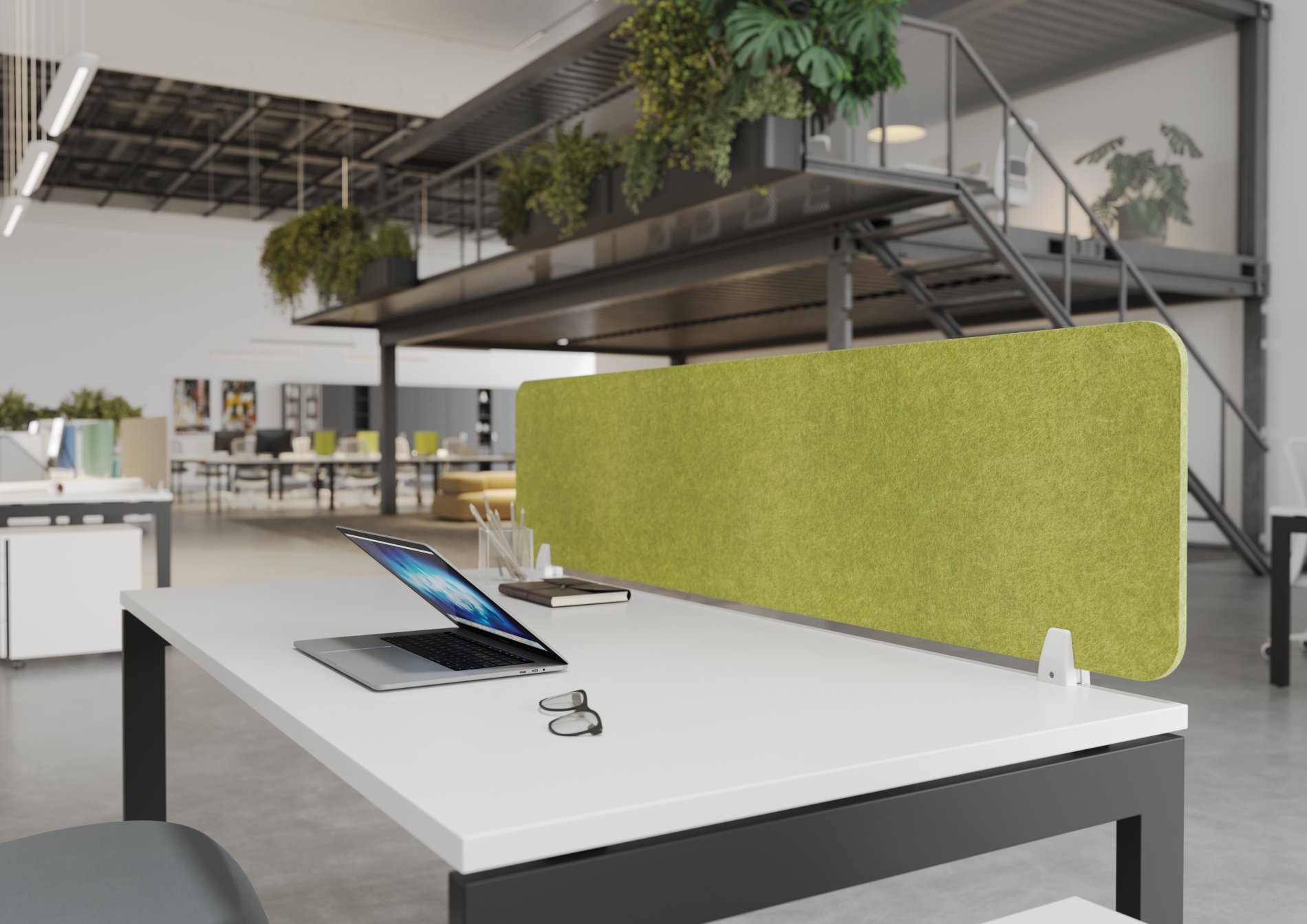 Przegrody z płyty melaminowanej do montażu między biurkami. Pozwalają na wydzielenie przestrzeni i stworzenie większej prywatności.