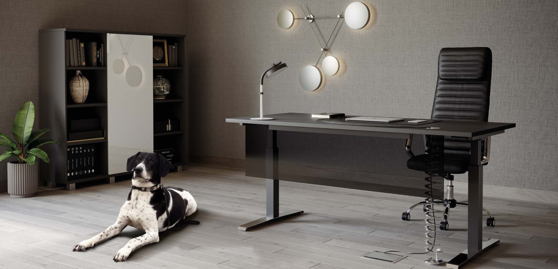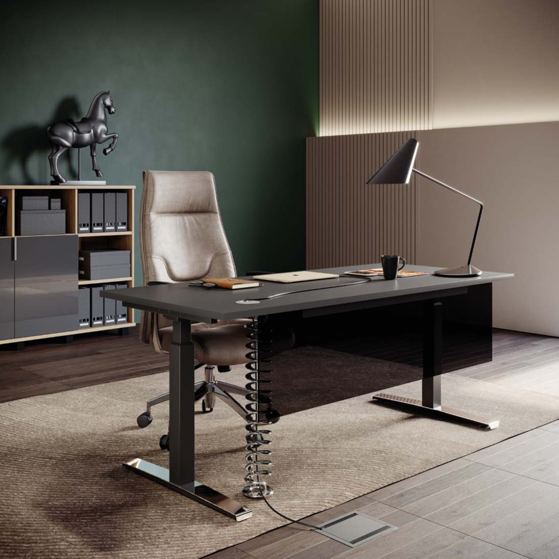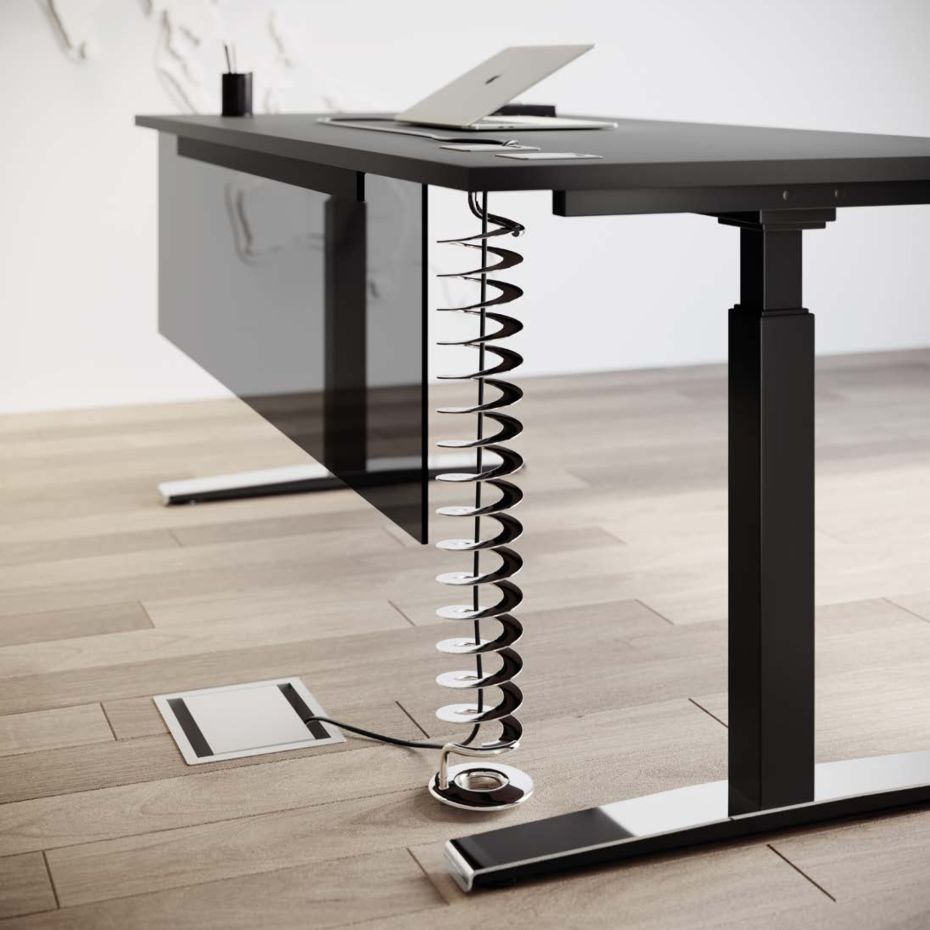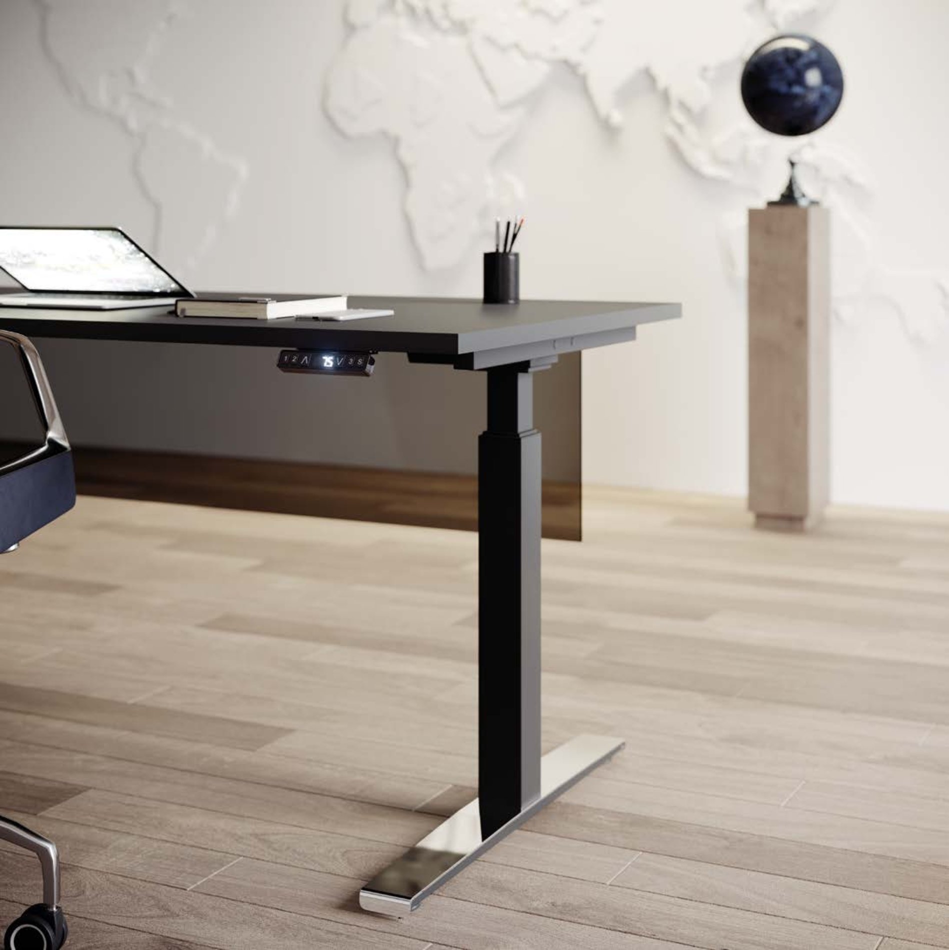 Ergonomiczne biurko z regulacją elektryczną. Polerowana nakładka na stopę dodaje elegancji. Regulacją można dostosować wysokość biurka do wygodnej pozycji podczas pracy.